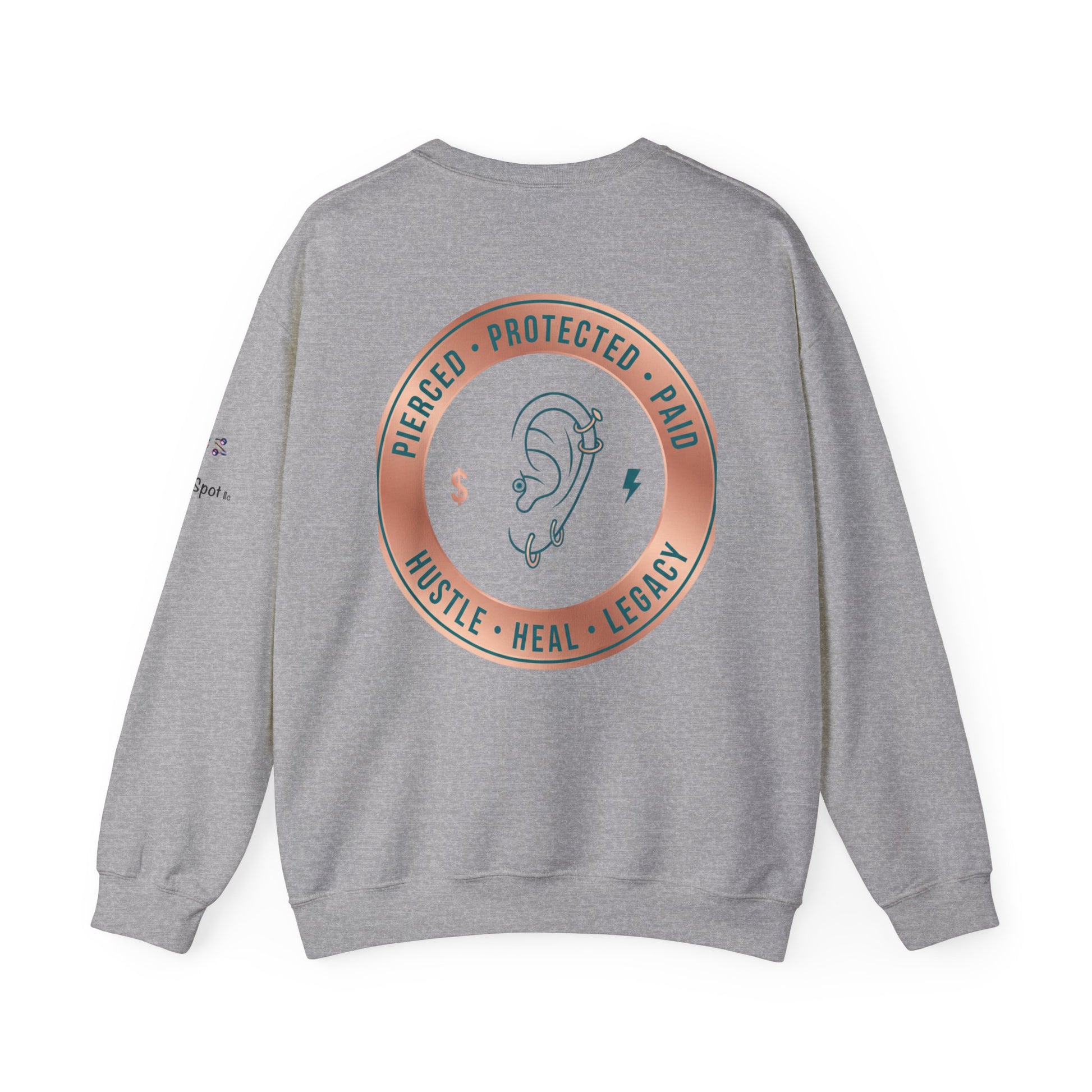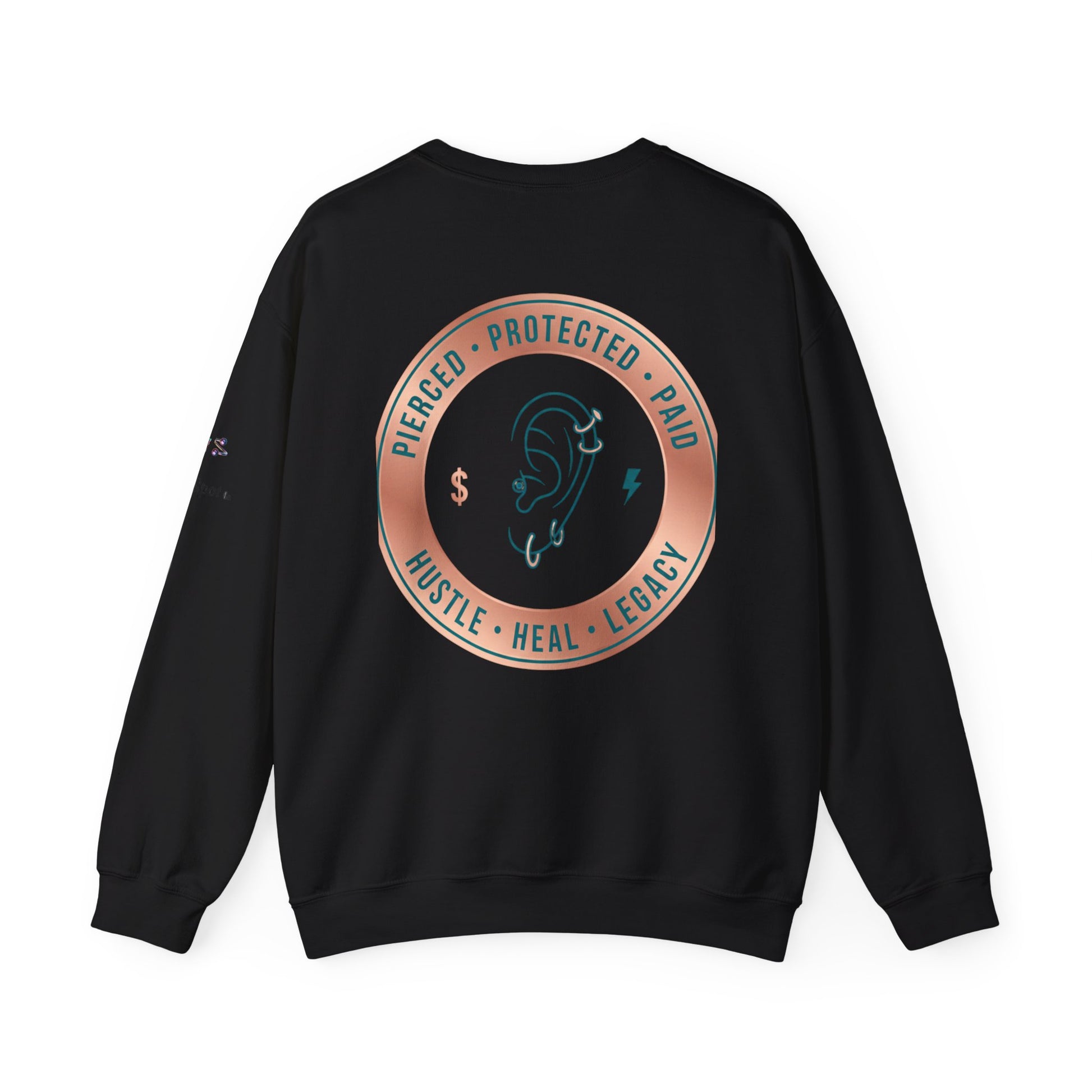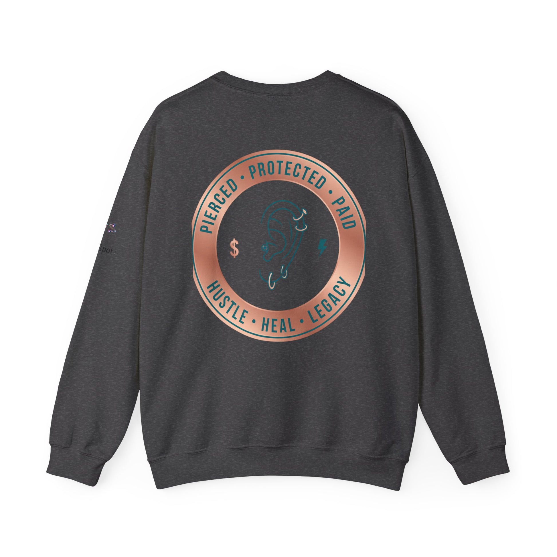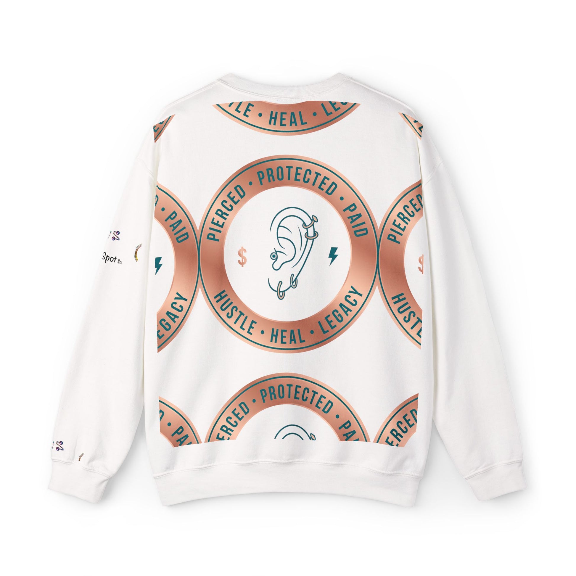 Soft, warm, and quietly empowering — this crewneck wraps you in calm confidence. The clean white fabric carries soft teal and rose-gold graphics that read “hustle heal repeat” on the chest and a bold circular emblem across the back: an ear with piercings framed by the words “pierced • protected • paid” and the tagline “hustle • heal • legacy.” It’s relaxed but structured — roomy through the body with a classic crew neckline and durable double-needle stitching so it moves with you during late nights, studio sessions, or slow mornings of recovery. Subtle sleeve details add personality without shouting, and options for embroidered accents bring a handcrafted touch.